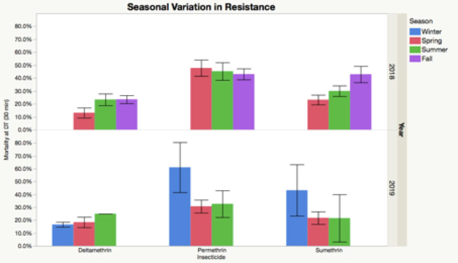 Insecticide Resistance Monitoring: We have set up a monitoring system to assess insecticide resistance in Aedes mosquito populations along the TX/MS border. Initiated in 2017, we aim to collect long term data about the evolution and change in resistance in mosquito populations, as well as identify any seasonal variation or geographic variation. We work closely with local city vector control in this effort, as we hope our data will allow for more effective control efforts. This work is funded by the Texas Department of State Health Services.